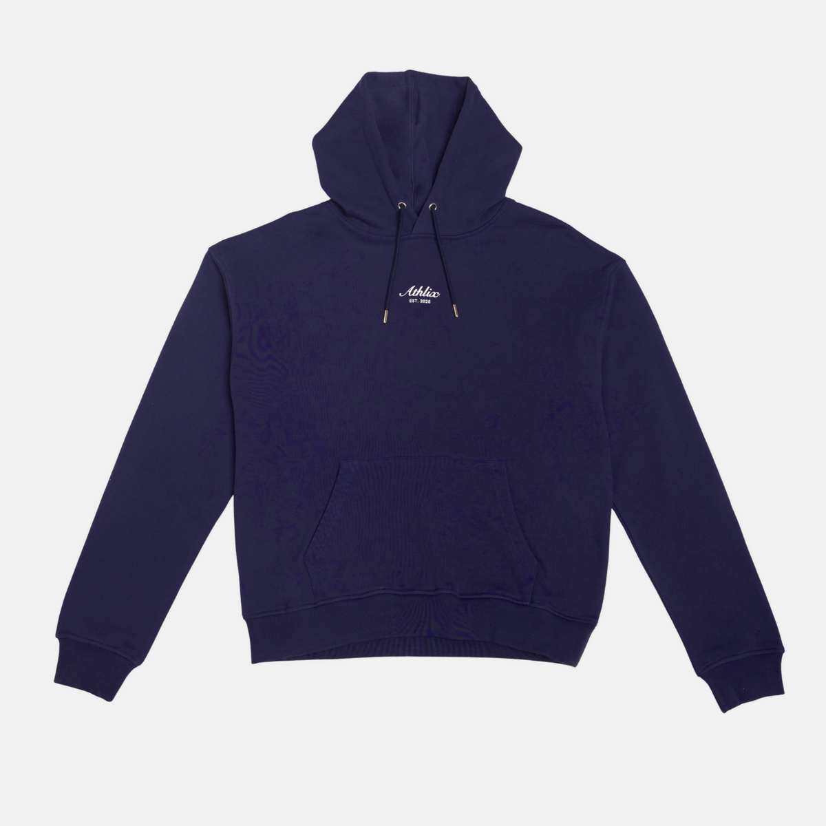 Der Athlix Running Club Hoodie in Navy – gemacht für Abendläufe mit der Crew, lange Off-Season-Blöcke und alles dazwischen. Schwerer Baumwollfleece steht satt am Körper und gewinnt mit jeder Session mehr Charakter. Die oversized, boxy Silhouette setzt ein klares Statement; die doppellagige Kapuze sitzt kompakt und ready. Vorn markiert der Print den Start, hinten trägt der Running-Club-Schriftzug die Energie nach außen – direkt, präsent, kompromisslos.