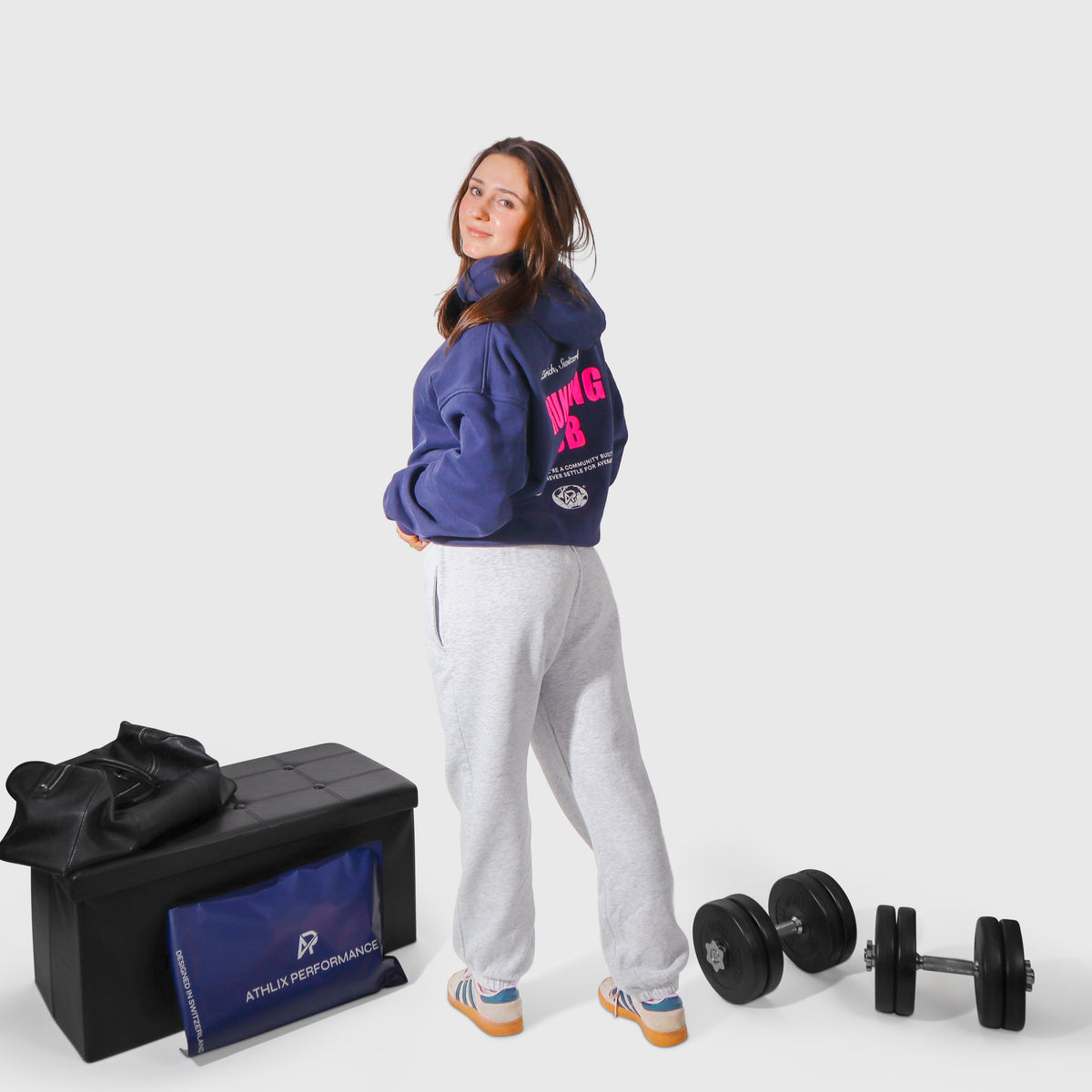 Der Athlix Running Club Hoodie in Navy – gemacht für Abendläufe mit der Crew, lange Off-Season-Blöcke und alles dazwischen. Schwerer Baumwollfleece steht satt am Körper und gewinnt mit jeder Session mehr Charakter. Die oversized, boxy Silhouette setzt ein klares Statement; die doppellagige Kapuze sitzt kompakt und ready. Vorn markiert der Print den Start, hinten trägt der Running-Club-Schriftzug die Energie nach außen – direkt, präsent, kompromisslos.
